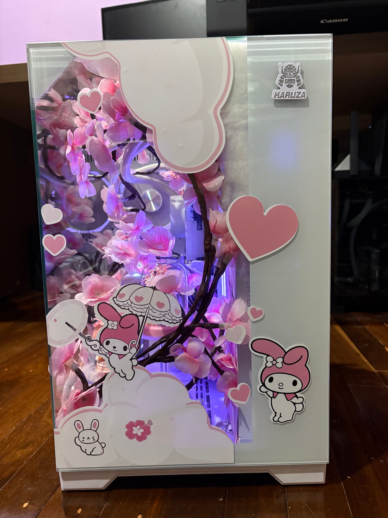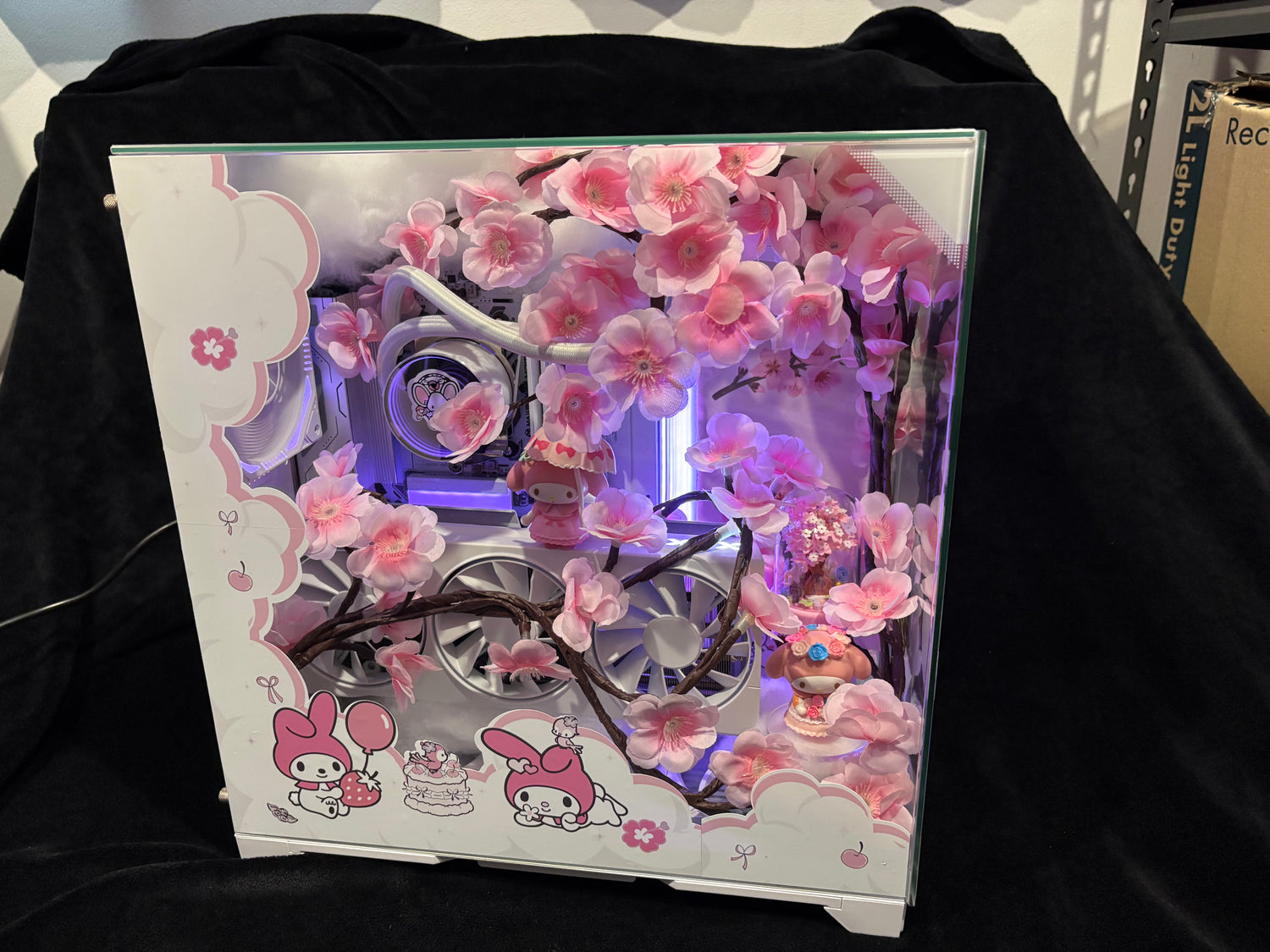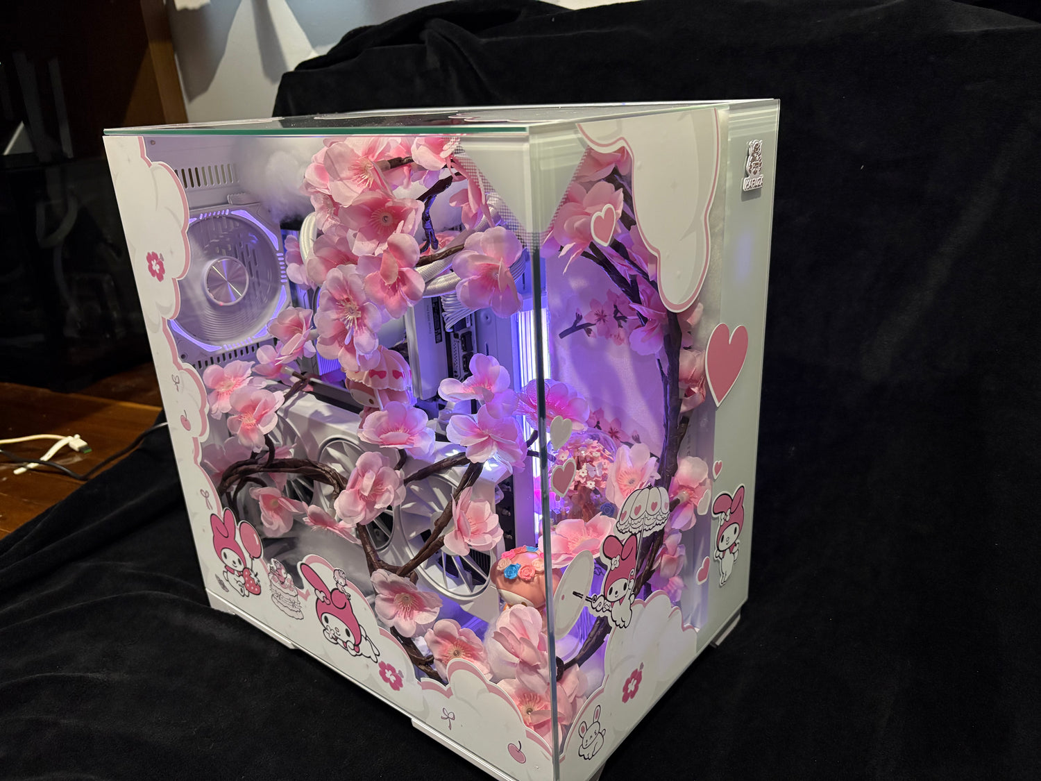 So all in all skipping the software and firmware stuff and the fan curve setup, everything was pretty much in place. I had a scene. As was always the plan I put in some synthetic fabric to simulate clouds and cover basic boring things that might make someone think it's just a computer. But even then it was 90% my melody 10% cherry blossoms and it still looked like a computer build and not a world. So in came a 2 meter sakura branch with led blossoms. And it came in aggressively. It was hard to tame, and things got messy. But I sort of let it be because that's life, right?